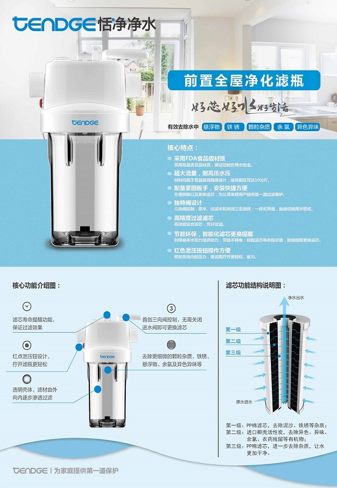 恬凈前置全屋凈化濾瓶TQ-P2能有效去除水中的懸浮物、鐵銹、顆粒雜質、余氯、異色異味,它采用FDA食品級材質,高精度過濾濾芯,體積小巧,安裝方便。恬凈前置全屋凈化濾瓶TQ-P2能承受高水壓,流量超大,智能濾芯提醒功能,節能環保。