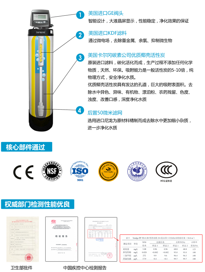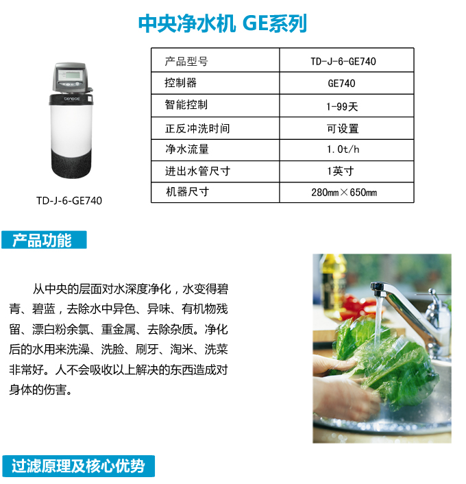 恬凈中央凈水機有效去除水中的異色、異味;進一步濾除水中微小雜質、膠狀體;去除水中的漂白粉余氯、農藥、重金屬;保留對人體有益的礦物質。使水變得碧清、碧藍,去除對人體有害的物質。